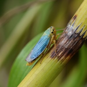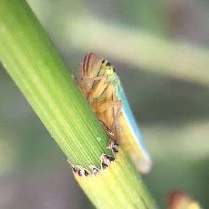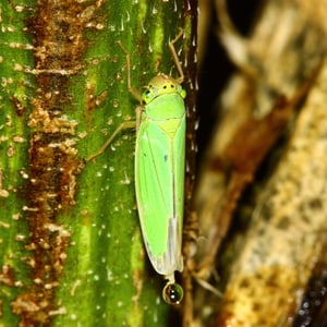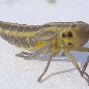 The adult males of Cicadella viridis can reach a length of 5.7–7 millimetres (0.22–0.28 in), but the females are quite larger than the males, reaching 7.5–9 millimetres (0.30–0.35 in).Their pronotum and scutellum are green and yellow. The front head is pale yellow, with two black spots near the compound eyes. The forewings are turquoise green in the females, blue or dark bluish in males (sexual dimorphism). The abdomen is bluish-black. The larvae are yellowish and have two brownish stripes running from head to the end of the abdomen.