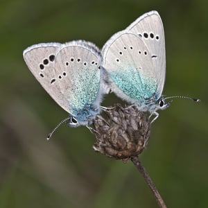 L. cyllarus Rott. (= damoetas Schiff.) (82 f). Male above light cyaneous blue with a violet sheen and narrow black border; female darker blue with the black border gradually shading off, so that it occupies nearly the whole outer half of the wings. Beneath silver-grey (male) or ashy grey (female), the forewing with 5 or 6 large rounded black spots, the hindwing with small ocelli and in its whole basal half with metallic blue-green dusting. In ab. dimus Bgstr. the ocelli of the forewing beneath are reduced to 4; on the other hand, they may also be increased in number, or may be elongate (= subtus-radiata Oberth.). In European Turkey and the neighbouring districts of Anterior Asia the ocelli of the forewing appear to be constantly or at least commonly enlarged, the blue also being darker; this is ab. tristis Gerh.. Throughout Central and Southern Europe, North Africa and North Asia to the Amur; absent from England and Japan. — ab. andereggii Ruhl (82 g) occurs in the Alps (perhaps also elsewhere); it is a large female-form which is above entirely black-brown, the underside being dark ashy grey, with the very large ocelli placed in pale rings.— blachieri Mill. (82 g) is a very small form from Southern France and the Yalais which has beneath only 4 ocelli on the forewing and very scanty blue-green dusting at the base of the hindwing; above darker and duller blue. — coelestina Mill., nec Ev. (82 g) is similar to the preceding form; above very dull in colour, underside with blue-green scaling only in the basal half, the ocelli of the forewing reduced in size, those of the hindwing almost obsolete. — lugens Car. (82 g) has altogether lost the ocellli of the hindwing; the male is darker blue above, the female being entirely black-brown almost like the female of semiargus without any blue; the blue-green scaling on the hindwing beneath is entirely absent or nearly. — aeruginosa Stgr., from South Russia, Asia Minor (especially the Lebanon) into Central Asia, has the hindwing beneath entirely dusted with blue-green. — laetifica Pung., from the Ili R., has similar underside, but the blue of the upperside is purer and more brilliant in both sexes; the club of the antenna has a different shape (being more elongate) and is reddish yellow on the innerside, so that Pungeler regarded laetifica as being perhaps a distinct species. — Larva green or brownish, with reddish brown dorsal line accompanied by dark oblique parallel stripes which stand close together; head black. In June and the autumn on Cytisus, Genista, Astragalus, Melilotus, etc. Pupa greyish brown. North of the Alps, where occurs only one brood, the larva probably hibernates. The butterflies occur singly but are mostly common, being found on clearings in timber-woods and on wide roads, where they flutter along usually 1 to 2 m above the ground, with a slow, straight, flapping flight. They appear in the South in the spring and again from July onwards, in the North only once, at the end of May and in June.