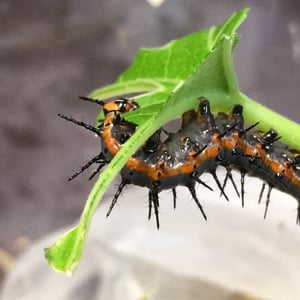 In appearance, the larvae are dark orange with small black spines protruding outward from the body. The larval stages of gulf fritillaries include five instars, each with a varying timeframe. After the eggs hatch, the new larvae eat the egg casings for food. Eventually, the larvae will transition either to consuming other eggs or parts of the host plant for nourishment. Throughout the first three instar stages, the larvae primarily consume the leaves and feed away from the leaf margins of the host plant. How much of the leaf and how deep into the layers the larva will eat depend on the type (i.e. thickness or thinness) of the leaf in question. Throughout the last two instar stages, the larvae mainly consume the leaves and feed at the leaf margins. Throughout this food acquisition process, the degree to which a specific leaf is eaten before it is abandoned in favor of another newer leaf largely depends on whether food is in plentiful or scarce supply. The average duration of the larval stage is between 11 and 16 days depending on the temperature.