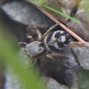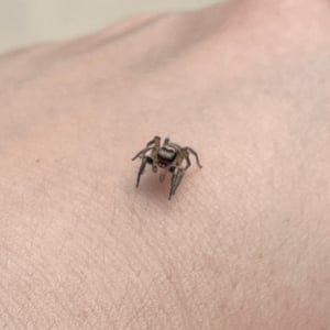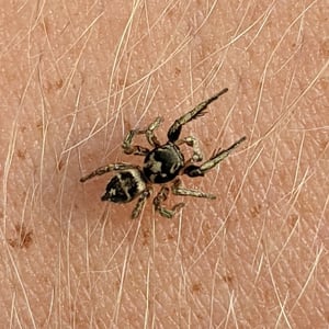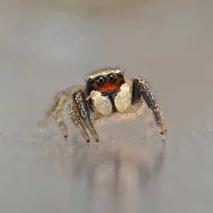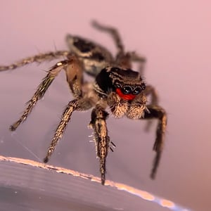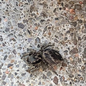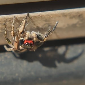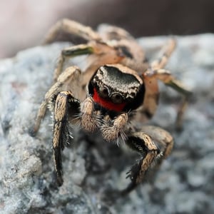 The spider is mostly black, with bands of tan scales. The male clypeus is covered with red scales.