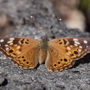 A. celtis visits flowers in an unusual way. On the rare occasion that the butterfly visits flowers for feeding, it does not allow its feet or its antennae to touch the flower. Only the proboscis is used to touch parts of the flower, which suggests that the butterfly would be an ineffective pollinator. This is considered to be “cheater” behavior. Typically, the specialized relationship of flowering plants and butterflies results in mutual benefit, in that the butterfly gains nutrients from flower visits while the host plant gains reproductive fitness from assistance in pollination. However, the hackberry emperor likely does not aid in pollination in any significant way.