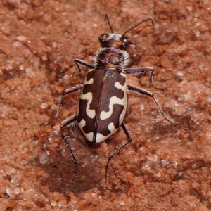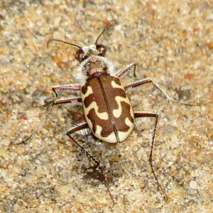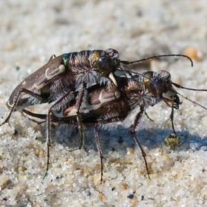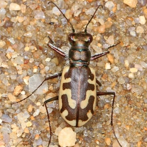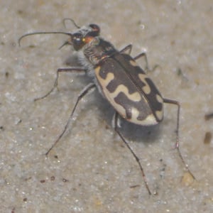 Cicindela hirticollis is a species of tiger beetle that is commonly found in sand bars and sandy beaches, is medium-sized, is about 2–14 mm (0.08–0.55 in) long, and is active in the summer. The dorsal surfaces of the head, prothorax, and elytra are dark brown. The elytral markings are very light-colored cream or white. The species' common names are hairy-necked tiger beetle and moustached tiger beetle. Its population is in decline.