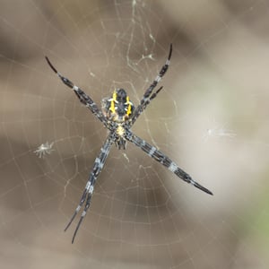 This species shows an evident sexual dimorphism. The strikingly black and yellow females are 2 - 2.5 in long, including legs, while the brown males reach only about 0.75 in. On Guam, where Argiope appensa is ubiquitous, it is frequently visited by Argyrodes argentatus, that steals food from the host. Following the introduction of the brown tree snake and the subsequent extinction or near-extinction of many of the island's small birds, spider populations on Guam exploded in response to decreasing predation and competition. Nature writer David Quammen has called Argiope appensa "almost certainly one of the larger species" which were encountered in vast numbers during his research trip to Guam for the book The Song of the Dodo.