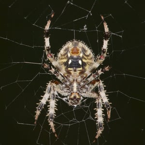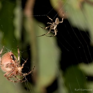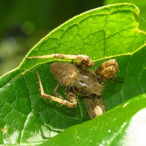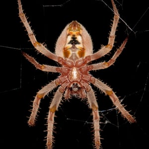 Neoscona crucifera is an orb-weaver spider in the family Araneidae. It is found in the United States from Maine to Florida in the east, to Minnesota in the Midwest, to Arizona in the southwest, southern California coastal communities and in Mexico. Its common names include Hentz orbweaver (after Nicholas Marcellus Hentz, spotted orbweaver, and barn spider. The name "barn spider" is also commonly used for a different spider, Araneus cavaticus. Generally nocturnal, females may become diurnal in the fall. Females are about 9.5 - 19 mm long, while males are somewhat smaller. The upper surface of the abdomen is brown and hairy. The legs display alternating light and dark brown bands. The undersurface of the abdomen is black, with two white spots. This species is relatively variable in color and sometimes pattern, but is most commonly seen sporting a rusty-red or golden orange color. The orb-shaped web is very large and is often constructed on buildings and other man-made structures, often several feet above ground, especially near outdoor lights. This species is most conspicuous in late summer and early fall. The orb part of the web may be nearly 2 ft in diameter. The eggsac consists of fluffy yellow threads in a rolled leaf over a lenticular or spherical egg mass 5 - 12 mm in diameter, which may contain up to 1,000 eggs. Juveniles are frequently preyed upon by mud daubers.