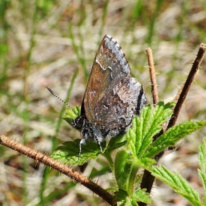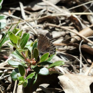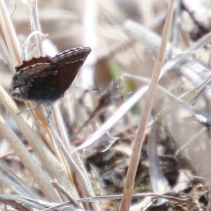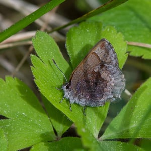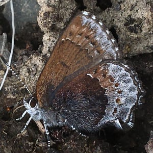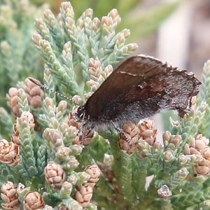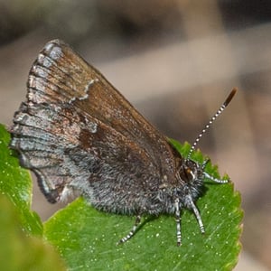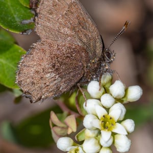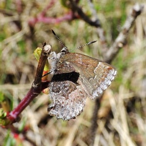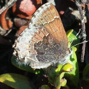 Callophrys polios, the hoary elfin, is a butterfly of the family Lycaenidae. It has a very local distribution in the United States from Maine south to New Jersey and in the Appalachian Mountains to Virginia, west across the Great Lakes states and the southern prairie provinces and north to Alaska. Along the Pacific Coast it is found to northern California and in the Rocky Mountains south to northern New Mexico. It is listed as a species of special concern and believed extirpated in the US state of Connecticut. The wingspan is 22–29 mm. The upperside is orangish brown and the underside brown. The forewing outer margin is frosted white and has an irregular postmedian line, which is white. The outer half of the hindwing is frosted light gray. Adults are on wing from April to June in one generation. The larvae feed on Arctostaphylos uva-ursi and possibly Epigaea repens. The adults feed on flower nectar from various species, including leatherleaf, pyxie, wild strawberry and willow. Hibernation takes place as a chrysalid.