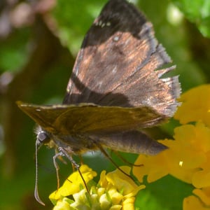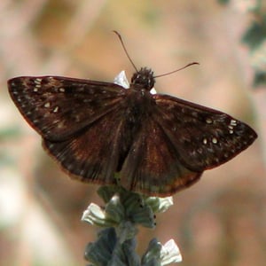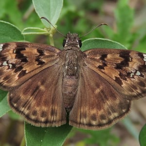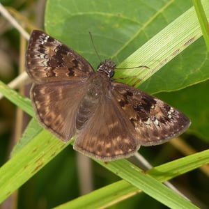 Erynnis horatius, the Horace's duskywing, is a butterfly of the family Hesperiidae. It is found from Massachusetts, west to eastern South Dakota, south through most of the eastern United States to Florida, the Gulf Coast, and southern Texas, south in the west through south-eastern Utah, Colorado, north-eastern Arizona, and New Mexico. It is listed as a species of special concern in the US state of Connecticut. Fringes are brown. Upperside of male forewing is dark brown with little contrast and no white overscaling. Upperside of female forewing is light brown with a contrasting pattern and large transparent spots. Underside of hindwing is usually without two spots below the apex. The male has a costal fold containing yellow scent scales; the female has a patch of scent scales on the 7th abdominal segment. The wingspan is 36–49 mm. There are two generations in the north, with adults on the wing from April to September; there are three generations in the deep south and Texas, with adults on the wing from January to November. Adults prefer open woodlands and edges, clearings, fence rows, wooded swamps, power-line right-of-ways, open fields and roadsides Caterpillars are hosted by both red and white oaks including willow oak (Quercus phellos), northern red oak (Q. velutina), scrub oak (Q. ilicifolia), water oak (Q. nigra), post oak (Q. stellata), and live oak (Q. virginiana). Adults consume nectar from flowers up to about 4.5 feet tall, including dogbane, buttonbush, sneezeweed, goldenrod, peppermint, boneset, and winter cress.