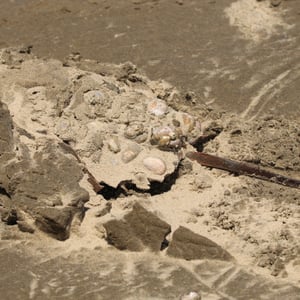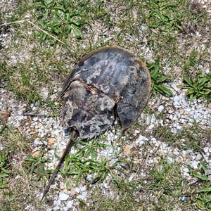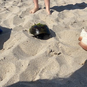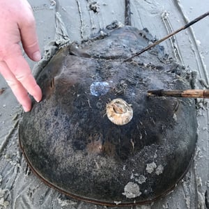 Xiphosurans move to shallow water to mate. The male climbs onto the back of the female, gripping her with his first pair of walking legs. The female digs out a depression in the sand, and lays from 200 to 300 eggs, which the male covers with sperm. The pair then separates, and the female buries the eggs. The egg is about 2 - 3 mm across, and hatches into a larva that superficially resembles a trilobite. Indeed, it is often referred to as the 'trilobite larva'. Through a series of successive moults, the larva develops additional gills, increases the length of its caudal spine, and gradually assumes the adult form. Modern xiphosurans reach sexual maturity after about three years of growth.