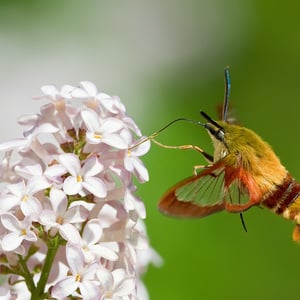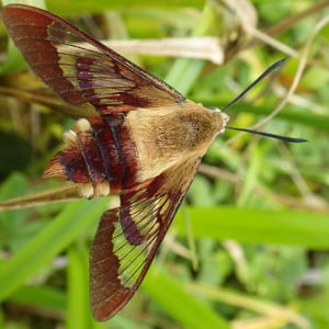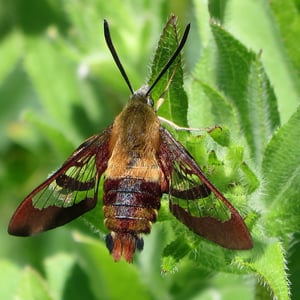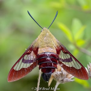 Hemaris thysbe, the hummingbird clearwing, is a moth of the family Sphingidae (hawkmoths). Coloration varies between individuals, but typically the moth is olive green and burgundy on its back, and white or yellow and burgundy on the underside. Its wings are transparent with a reddish-brown border. It has light-colored legs, which combined with the lack of striping on the underside is diagnostic. Beating its wings rapidly, H. thysbe hovers to collect nectar from a variety of flowers. The combination of its appearance and its behavior commonly leads to it being confused with a hummingbird or bumblebee. Hemaris thysbe is found in a large portion of North America, with a range extending from Alaska to Oregon in the west and from Newfoundland to Florida in the east. It is a migratory species and is most common in southern Ontario and the eastern United States. H. thysbe has two broods a year in the southern portion of its range, but only one in the north. As a caterpillar, it feeds on honeysuckle, dogbane, and several types of fruit trees. Due to the variable appearance of H. thysbe, it has often been mistakenly described as multiple distinct species. It was first described by Johan Christian Fabricius in 1775. The moth is a flower pollinator.