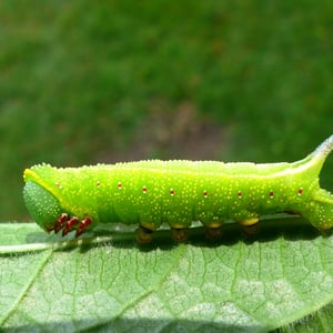 The body of an adult Hemaris thysbe moth is spindle shaped, and is largely covered by a thick coat of fur. There is significant variation in coloration between individuals. Typically, the back side of the moth is olive to golden-olive on the thorax and burgundy to black with light olive to dark golden patches on the abdomen. The underside of the moth is white to yellow on the thorax and burgundy to black on the abdomen. When it first hatches, the wings of H. thysbe are dark red to black. As it begins to fly, scales fall off leaving a mostly clear wing with reddish-brown borders and veins. The width and shape of the border as well as the patterning of the veins vary between individuals. The moth beats its wings quite rapidly and has a wingspan of 4 to 5.5 cm. H. thysbe has light-colored, often yellow legs. In general, southern broods and individuals hatched later in the season are darker in color. Southern and eastern populations generally exhibit jagged wing borders, while northern and western ones are usually smooth. The antennae of H. thysbe are thicker at their base and are curved at the ends. Unlike most moths, the species lacks hearing organs. It has compound eyes and well-developed reproductive organs. Hemaris thysbe can be distinguished from Hemaris gracilis and Hemaris diffinis by the lack of stripes on the underside of its thorax and by its pale legs. (Legs are reddish in H. gracilis and black in H. diffinis.) The H. thysbe caterpillar is yellowish green with bands of dark green and reddish brown to dark brown. It has a granulose body with small, white spots and a white horn projecting from its posterior. As a caterpillar, H. thysbe feeds on cherry trees, European cranberry bush, hawthorns, dogbane, honeysuckle, and snowberry. It burrows into the soil to overwinter as a brown, hard-shelled pupa. In the late spring, it emerges as an adult moth. H. thysbe lays green eggs on the underside of plant leaves, which hatch in about a week. Development takes four weeks, after which the caterpillar spins a cocoon at ground level. Two to four weeks later a moth emerges for a second breeding cycle before summer's end in southern climates. In northern climates, H. thysbe has a single mating cycle per year. The mating and other behavioral habits of H. thysbe have not been well studied. Adults are most active during the hottest parts of the day, but remain active until sunset. H. thysbe collects nectar from a wide variety of flowers using a long (19 - 21 mm) proboscis while hovering above the bloom. It shows a preference for pink and purple flowers, moving rapidly from one flower to the next. The moth is considered to be a hummingbird mimic and is frequently mistaken for the bird or for a bumblebee.
