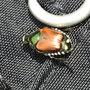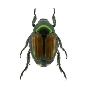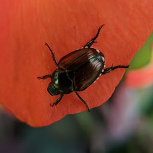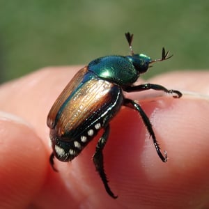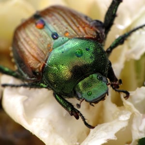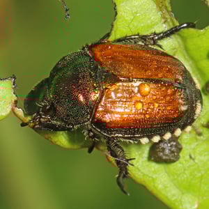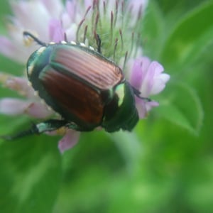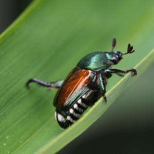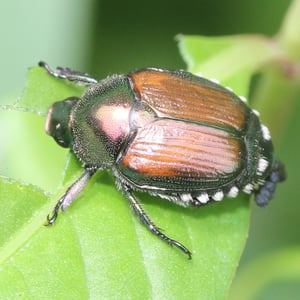 The Japanese beetle (Popillia japonica) is a species of scarab beetle. The adult measures 15 mm (0.6 in) in length and 10 mm (0.4 in) in width, has iridescent copper-colored elytra and a green thorax and head. It is not very destructive in Japan, where it is controlled by natural predators, but in North America, it is a noted pest of about 300 species of plants including rose bushes, grapes, hops, canna, crape myrtles, birch trees, linden trees, and others.The adult beetles damage plants by skeletonizing the foliage, that is, consuming only the leaf material between the veins, and may also feed on fruit on the plants if present, while the subterranean larvae feed on the roots of grasses.