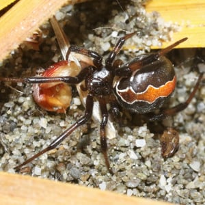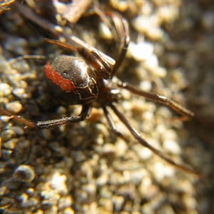 The katipō (Latrodectus katipo) is an endangered species of spider native to New Zealand. It is one of many species in the genus Latrodectus, such as the Australian redback (L. hasseltii), and the North American black widow. The species is venomous to humans, capable of delivering a potentially dangerous bite. It is a small to medium-sized spider, with the female having a round black or brown pea-sized body. Red katipō females, found in the South Island and the lower half of the North Island, are always black, and their abdomen has a distinctive red stripe bordered in white. In black katipō females, found in the upper half of the North Island, this stripe is absent, pale, yellow, or replaced with cream-coloured blotches. These two forms were previously thought to be separate species. The male is much smaller than the female and quite different in appearance: white with black stripes and red diamond-shaped markings. Katipō are mainly found living in sand dunes close to the seashore. They are found throughout most of coastal New Zealand except the far south and west. Katipō feed mainly on ground dwelling insects, caught in an irregular tangled web spun amongst dune plants or other debris. After mating in August or September, the female katipō produces five or six egg sacs in November or December. The spiderlings hatch during January and February and disperse into surrounding plants. Due to habitat loss and colonisation of their natural habitat by other exotic spiders, the katipō is threatened with extinction. A katipō bite produces the toxic syndrome latrodectism; symptoms include extreme pain and, potentially, hypertension, seizure, or coma. Bites are rare, an antivenom is available, and no deaths have been reported since 1901. The katipō is particularly notable in New Zealand as the nation is almost entirely devoid of dangerous native wildlife; this unique status means the spider is well known, despite being rarely seen.