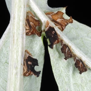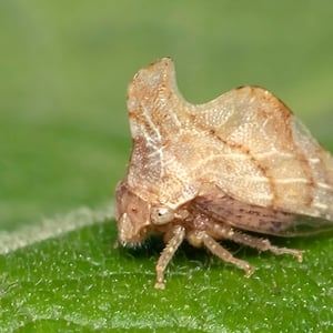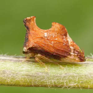 Morphology Keeled treehoppers have unique saddle shaped keels, and are small and brown. The species exhibits sexual dimorphism, females are typically 1/4 of an inch (6.35 mm) long with more pronounced keels while males are smaller, and their keels less noticeable. On occasion, males appear so differently that they are misidentified. Life Cycle As adults, keeled treehoppers spend the winter months in leaf litter and debris, finally emerging in March. They begin to reproduce and implant their eggs on aster leafs. During this time of year plants produce vulnerable growth and soft tissues which make it an optimal time to embed their eggs. Occasionally the laid eggs cause the leaf to fold over, forming a protected environment for the nymphs to develop in once they hatch. Behavior Keeled treehoppers mothers exhibit parental care and spend time protecting their egg masses. They are phloem feeders, and their diet consists of liquids extracted from plants. Plant sap, while a convenient material to feed on, is lacking in many different nutrients including essential amino acids. Because their food source is so nutrient poor, keeled treehoppers rely on gut symbionts in order to supplement their diet.
