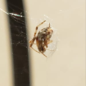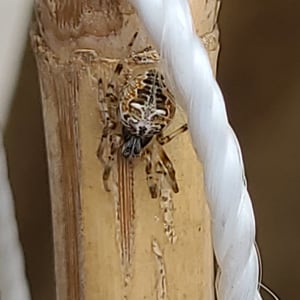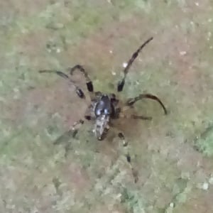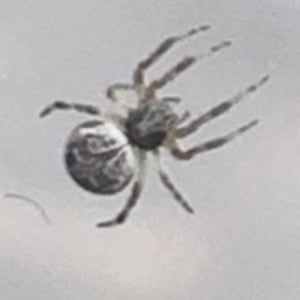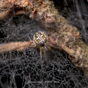 Metepeira labyrinthea, the labyrinth orbweaver, is a spider, with thin legs and a round, bulbous abdomen It is a member of the genus Metepeira in the family Araneidae. The female’s length is 5.3 mm, its carapace 2.3 mm, abdomen 3.3 mm, and extended legs 18.4 mm. The carapace is brown or gray, and the abdomen is dark with a white pattern. The legs alternate pale brown and dark brown, and the sternum is dark brown with a longitudinal yellow mark. The male spider is three-quarters of the female’s length, or slightly larger, with a darker carapace and with greater contrast between dark and light areas of the legs. Metepeira are easily distinguished from other Araneidae by their light eye region, white median line on the sternum, relative length of the leg segments, small male palpus, weakly sclerotized epigyne and the special composite web.