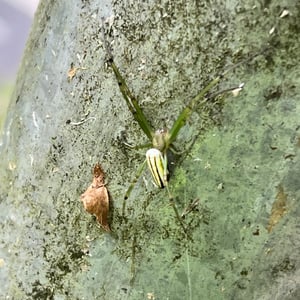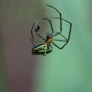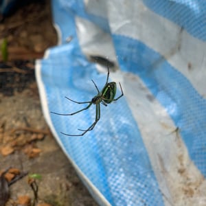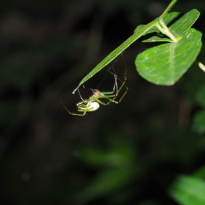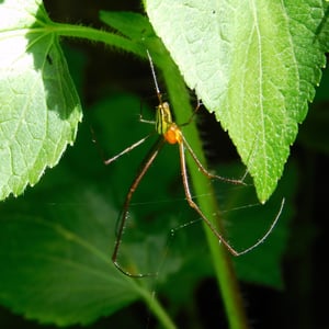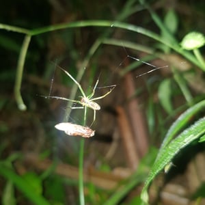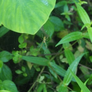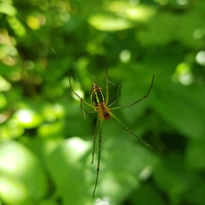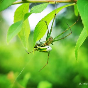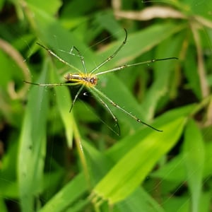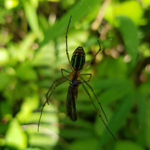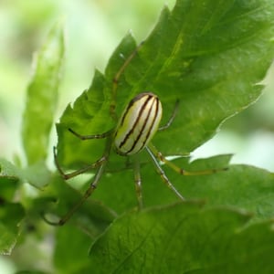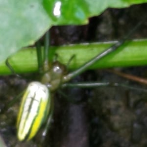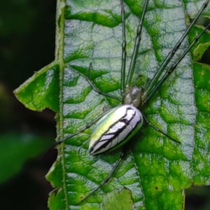 Leucauge celebesiana, commonly called the black-striped orchard spider, is a species of spider belonging to the family Tetragnathidae. It is found from India to China, Japan, Sulawesi and New Guinea. Like many of its congeners, this is a colourful and distinctive spider. It has a body length (excluding legs) of 13 mm. The abdomen is white with yellow-green sides with black stripes separating the white from the coloured flanks. Another black stripe runs right down the middle. This species constructs a web inclined at 45° and several individuals often build these webs close together. Leucauge subblanda is a similar spider found in Japan.