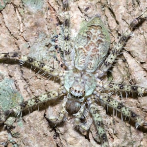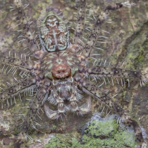 Pandercetes is a genus of huntsman spiders that was first described by Ludwig Carl Christian Koch in his 1875 treatise on Australian spiders. They are mainly distributed in tropical Asia and Australia, and are known for their cryptic coloration that matches local moss and lichen. Their legs have lateral hairs, giving them a feathery appearance, further masking their outline against tree trunks. Their head is somewhat elevated and the carapace has the thoracic region low and flat. The genus is characterized by the internal anatomy of the reproductive structures. Males have irregular coils at the terminal end, while females have screw like copulatory ducts.
