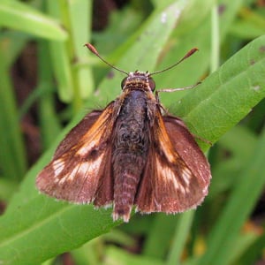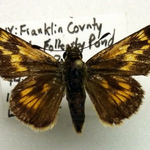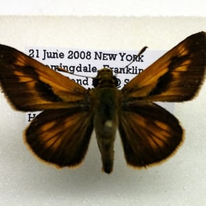 Polites mystic, the long dash or long dash skipper, is a species of butterfly. The species is commonly found in north of North America and in mountains in the south of North America, in grassy habitats. The grassy areas include meadows, marshes, streamsides, wood edges, and prairie swales. On the top, the species has dark brown reddish to yellowish-orange markings. The forewing of the female has a broad black patch at the base. The forewing of the male has a long, slightly curved stigma which may be connected to the dash near the apex. Underneath the hindwing, the species is orange brown with a curved band of equal-sized yellow spots.