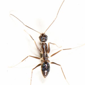 The worker longhorn crazy ant is about 2.3 to 3.0 mm long with a brownish-black head, thorax, petiole, and gaster, often with a faint blue iridescence. The body has a few short, whitish bristles and the antennae and limbs are pale brown. Distinguishing this ant from other members of its genus, Paratrechina, is easy because its antennae and legs are so long. The first segment of each antenna is more than twice as long as the length between its base and the back edge of the head. The eyes are elliptical and set far back on the head. It has no sting, but the ant can bite and then curve its abdomen forwards and secrete formic acid onto its prey. They are too feeble to harm humans. A characteristic of this ant is the way that the workers move around jerkily in apparently random directions.