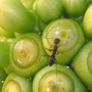 Colonies of longhorn crazy ants make their nests in a wide range of either dry or damp sites. These include inside hollow trees, under loose bark, in rotten wood, under logs or stones, among rubbish, and under undisturbed debris inside buildings. They thrive in convenience stores, gas stations, apartment blocks, schools, and cafés. The workers emerge to forage and the location of the nest can be identified by watching ants carrying food back to the colony. The ants are omnivorous and feed on seeds, dead invertebrates, honeydew, plant secretions, fruit, and a range of household scraps. Large food items may be moved by several ants working together. They consume honeydew predominantly in spring and autumn, and may tend aphids, mealybugs, and scale insects so as to maximise the secretions they produce. During the summer, they preferentially seek a high-protein diet. In buildings, they collect crumbs and the insect corpses found under lights. The longhorn crazy ant is able to invade new habitats and outcompete other species of ants. In 1991, in the large closed dome of the research station Biosphere 2 in the Arizona Desert, no particular ant species was dominant. By 1996, the longhorn crazy ant had virtually replaced all the other ant species. It fed almost exclusively on the honeydew secreted by the large numbers of scale insects and mealybugs present, and other invertebrates were greatly diminished. The ones that remained were either well armoured, such as millipedes and woodlice, or were tiny and lived underground, such as springtails and mites. The inquiline wingless ant cricket (Myrmecophilus americanus) is often found living in the nest of the longhorn crazy ant and is kleptoparasitic on it, stealing food scraps brought back by the workers and encouraging them to regurgitate food. It may be assisted in this symbiosis by mimicry, as it resembles the gaster of the queen in both size and shape. Some poorly-known species of fungi have been found in association with crazy ants in South America.