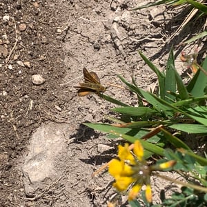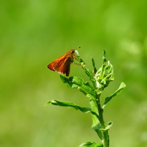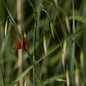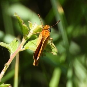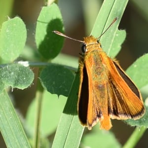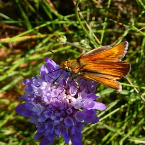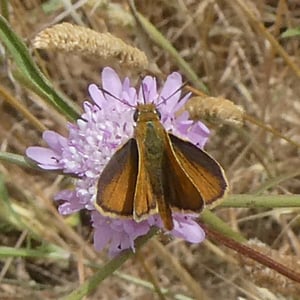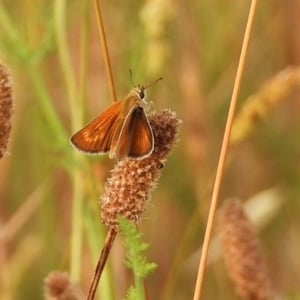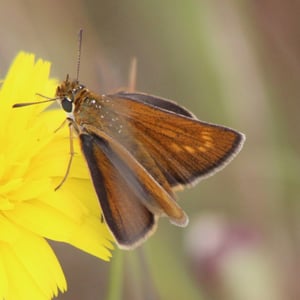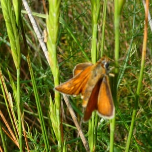 The Lulworth skipper (Thymelicus acteon) is a butterfly of the family Hesperiidae. Its name is derived from Lulworth Cove in the county of Dorset, England, where the first specimens in Great Britain were collected in 1832 by English naturalist James Charles Dale. The species occurs locally across Central Europe, Asia Minor and North Africa, where its population is considered stable. Its numbers have declined in Northern Europe, leading to its European status of "vulnerable". Its range in Britain is restricted to the south coast of Dorset, however it is locally abundant and its numbers currently are perhaps at their greatest since its discovery there. With a wingspan of 24 to 28 millimetres, females being larger than males, the Lulworth skipper is a small butterfly, the smallest member of the genus Thymelicus in Europe and among the smallest butterflies in Britain. Aside from the size difference, the sexes are distinguished by females having a distinct circle of golden marks on each forewing. Due to their likeness to the rays around the eye of a peacock's feather, these are often known as "sun-ray" markings, and they can faintly appear on males.