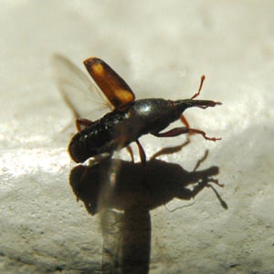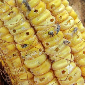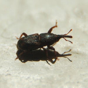 Sitophilus zeamais, commonly known as the maize weevil, is a small beetle belonging to the family Curculionidae. It is a major pest of stored grains, particularly maize (corn). Adult weevils are about 3-4 mm in length and have a dark brown coloration. They infest grains by laying eggs inside them, and the larvae feed on the grain, causing damage and reducing its quality.