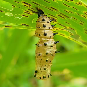 Females lay golden in colour globular eggs in a large cluster on the underside of the leaves. They hatch after about 3–4 days. The 6th (and final) instarcaterpillars are black with yellow spots and spines. Also the head is yellow. with long black cephalic horns. They are gregarious and usually occur in large numbers. They feed on leaves of Urticaceae (Pipturus argenteus, Pipturus arboresceus, Pouzolzia, Villebrunea species ) and Euphorbiaceae (Claoxylon).