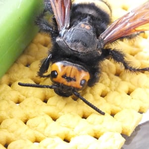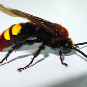 The mammoth wasp resembles a very large, elongated bumble bee. The female is larger than the male and has a yellow head, the male has a black head. Its body is covered in downy hair and is glossy black in colour with two yellow bands across its abdomen which are sometimes divided to form four yellow spots. Females have shorter antennae than males. The female also has large mandibles which are used to manipulate the prey.