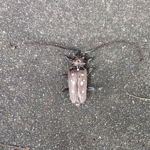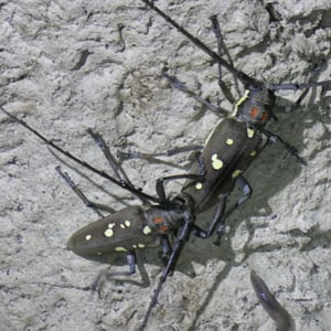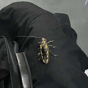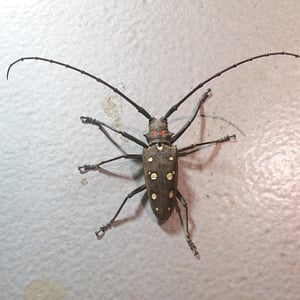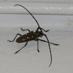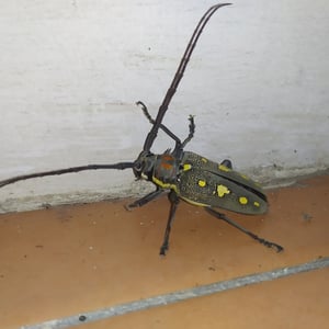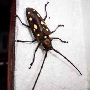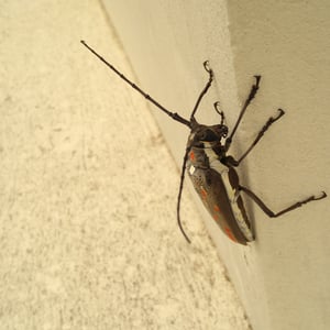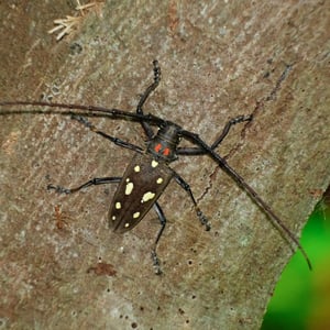 Batocera rubus, commonly known as the rubus longhorn beetle, is a large insect belonging to the family Cerambycidae. It is characterized by its robust body, long antennae, and striking coloration, with a black body and bright red elytra. This species is primarily found in Southeast Asia, where it inhabits forests and feeds on various types of wood, including fruit trees and timber. The rubus longhorn beetle is considered a pest in some areas due to its ability to cause damage to trees and crops.