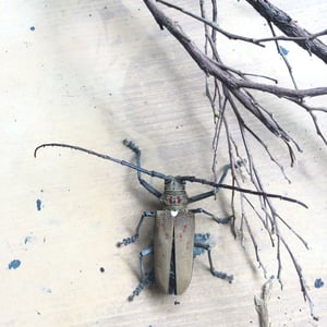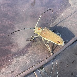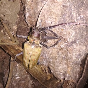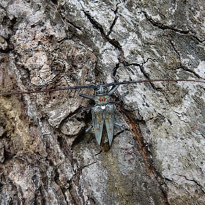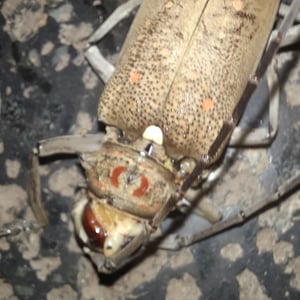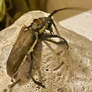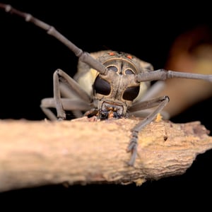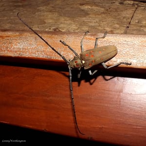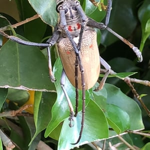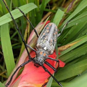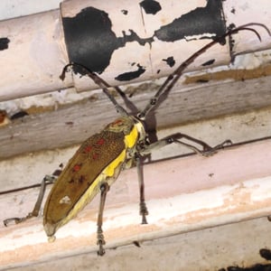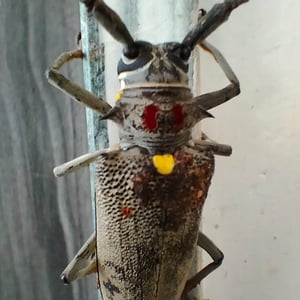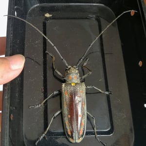 Batocera rufomaculata, commonly known as the red-spotted longhorn beetle, is a large insect belonging to the family Cerambycidae. It is characterized by its elongated body, reaching up to 5 centimeters in length, and its striking red spots on a black background. This beetle is primarily found in Southeast Asia, where it infests various tree species, causing damage to their trunks and branches. Its larvae bore into the wood, making it a significant pest in forestry and agriculture.