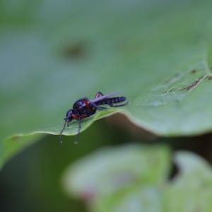Bibionid larvae grow up in grassy areas and are herbivores and scavengers feeding on dead vegetation or living plant roots. Some species are found in compost. Larvae are sometimes found in pockets in which sometimes up to 200 specimens have been counted. Adults of most Plecia and some species of Bibio do not eat, but subsist solely on the food taken in during the larval stage and drop steadily when in flight until they are a few inches above the ground, hovering slowly. Adult-stage bibionids are quite short-lived, and some species of Plecia (lovebugs) spend much of their adult lives copulating. The male and female (lovebugs) attach themselves at the rear of the abdomen and remain that way at all times, even in flight. Adults swarm after synchronous emergence, sometimes in enormous numbers.