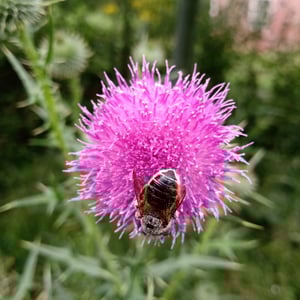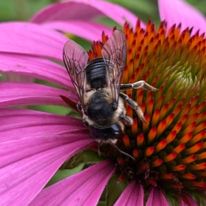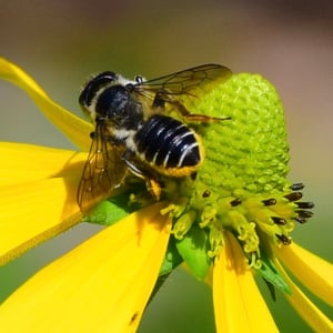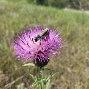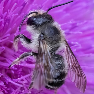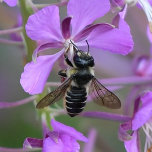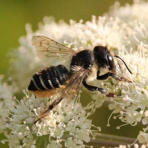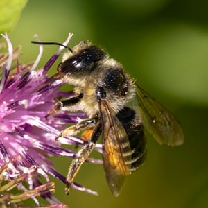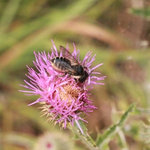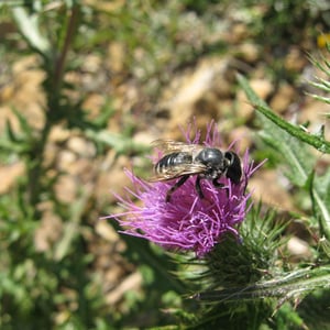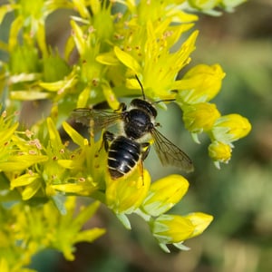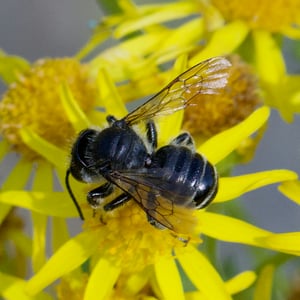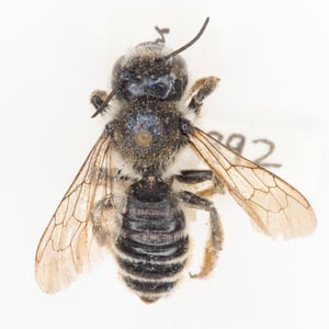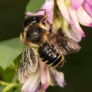 Megachile inermis is a species of solitary bee commonly known as the unarmed leafcutter bee. It is characterized by its medium-sized body, ranging from 10 to 15 millimeters in length, and its lack of spines or hairs on its body. This species is known for its leaf-cutting behavior, where females use their strong mandibles to cut circular pieces of leaves to construct their nests. Megachile inermis is found in various habitats, including forests, gardens, and agricultural areas, and plays an important role in pollination.