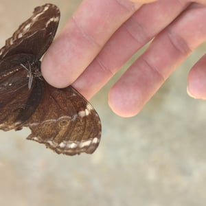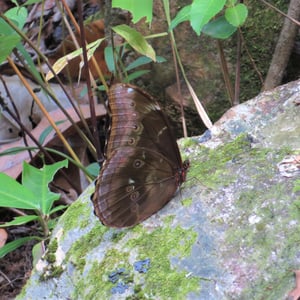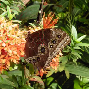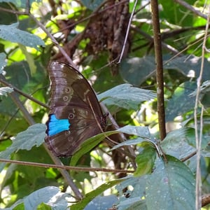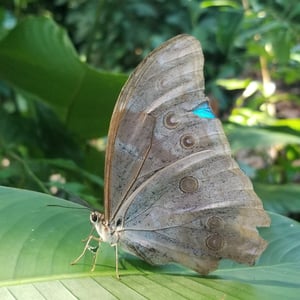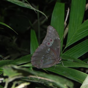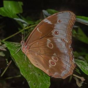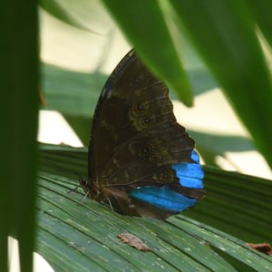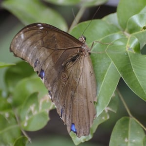 The Menelaus blue morpho (Morpho menelaus) is one of thirty species of butterfly in the subfamily Morphinae. Its wingspan is approximately 12 cm, and its dorsal forewings and hindwings are a bright, iridescent blue edged with black, while the ventral surfaces are brown. Its iridescent wings are an area of interest in research because of its unique microstructure. Due to its characteristic blue color, Morpho menelaus is considered valuable among collectors and was widely hunted in the 20th century. However, deforestation remains the main threat to the survival of this species.