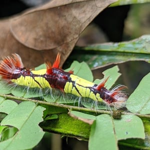 These social caterpillars feed on Erythroxylum, Dalbergia, and Fabaceae, and may prefer to feed on new leaves of host plants since these new leaves are easier and more nutritious to eat. The caterpillars are red brown in color with bright green spots. They are covered with bristles that release an irritant upon contact. Conversely, the peak of the caterpillar is in the dry season, a climate that is unsuitable for most animal communities. These caterpillars will enter diapause or suspend development and can delay pupation in order to survive this harsh period and the lack of water. As the dry season continues, the caterpillar population declines due to predation.