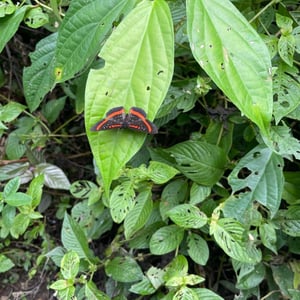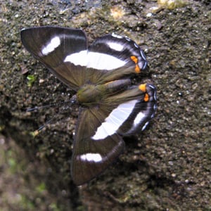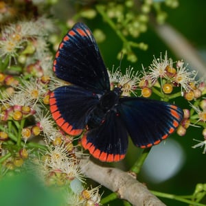 Species occur in a variety of habitats, but have a unique distribution focus in the tropical rain forests of South America. Many species are rarely found and have a relatively small distribution area. Species of the genus Charis were therefore used to reconstruct the history of the forest of the Amazon basin: each of the 19 species has a vicariant distribution area, three originally separate forests (upper, lower Amazonas, Guyana) can be derived from the relationship between the species. The food plants for the caterpillars total more than 40 plant families. Mostly young leaves or flowers are used, and rarely fallen, dead leaves or lichen are eaten. The larvae feed mostly individually not gregariously. However, gregarious caterpillars are found within the Euselasiinae (Euselasia), Riodinini (Melanis) and Emesini (Emesis), with some species demonstrating processionary behaviours. Available evidence from Euselasia and Hades suggests the gregarious trait may be widespread among members of the subfamily Euselasiinae. The larva of Setabis lagus (Riodininae: Nymphidiini), is predatory. There are records of predation on larvae of Horiola species (family Membracidae) as well as scale insects (Coccidae). Predatory feeding has also been shown in Alesa amesis. A number of species associate with and are protected by ants during one or more stages of their life cycle. A study in Ecuador based on adult male feeding records for 124 species in 41 genera of Riodinidae (out of a total of 441 species in 85 genera collected in the study) demonstrated that rotting fish and other carrion was the most frequently used food source in terms of numbers of individuals and taxa, attracting 89 species from 32 genera. Other food substrates visited in this study included flowers, damp sand or mud-puddling