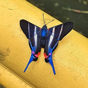 The family includes small to medium-sized species, from 12 to 60 mm wingspan, often with vibrant structural colouring. The wing shape is very different within the family. They may resemble butterflies in other groups, some are similar to Satyrinae, some are bright yellow reminiscent of Coliadinae and others (examples Barbicornis, Rhetus arcius, Helicopis, Chorinea) have tails as do Papilionidae. The colouration ranges from muted colours in the temperate zone species to iridescent blue and green wings and transparent wings in tropical species. The golden or silvery metallic spots on the wings in many species of the Americas gave them the English common name "metalmarks". A number of species mimic poisonous moths of several families and there are often extensive mimicry rings of similar-looking species, grouped around a model. Mimicry causes often closely related species to have completely different wing patterns, for example the genus Thisbe. Many species mimic the stain and stripe pattern of toxic Nymphalidae. Batesian mimicry seems to be more common than in any other insect family of similar size. Reasons for this are unknown. Another example is Ithomeis where different subspecies resemble the species they mimic in different parts of the geographic range more than they resemble each other. The delimitation from the closely related Lycaenidae by morphological autapomorphy is difficult. The first pair of legs of the males, which arises on the prothorax, is less than half as long as the legs of the pterothorax and they are not used for walking. The individual segments of the tarsus are sometimes fused together and fused with the tibia, and the pretarsi have no claws. This feature is also found in some Lycaenidae (and also the Monotrysia), but in these the legs are always much longer. The sensory hairs on the tarsi of the female forelimbs are arranged in a group. These groups which are arranged in pairs can be found in the other taxa of the Papilionoidea. The third problematic apomorphy is the absence of the rear projections (apophyses) of the female genitalia. This feature (absence) is found as well in some species of the subfamily of Poritiinae. In almost all Riodinidae, the coxae of the front legs are extended on males jutting out over the trochanter (only hinted at in Styx infernalis and Corrachia leucoplaga). If there are similar projections in Lycaenidae (in genera Curetis, Feniseca and Poritia), they are built differently in detail and may be, for example, dorsally convex. In addition, almost all Riodinidae in contrast to the Lycaenidae have a humeral vein in the hindwings and the costa is thickened (exceptions in the subfamily Hamearinae). The head in relation to the eyes is wider than in Lycaenidae, making the antennal bases further away from the eye. The relatively long antennae often reach half of the front wing length. Riodinidae have an unusual variety in chromosome numbers, only some very basal groups have the number typical for butterflies (between 29 and 31) or the number characteristic of Lycaenidae (23 to 24). Numbers between 9 and 110 occur. In some cases, representatives of a morphologically indistinguishable cryptospecies have different chromosome numbers and are reproductively isolated.