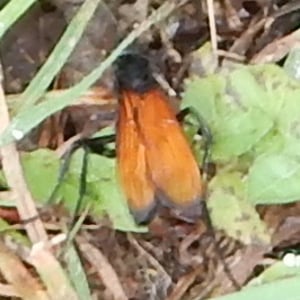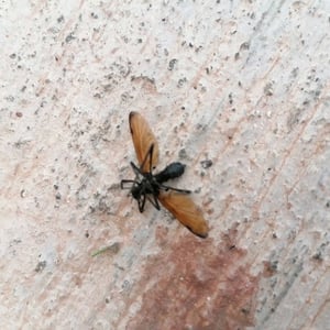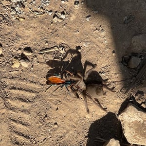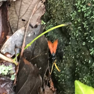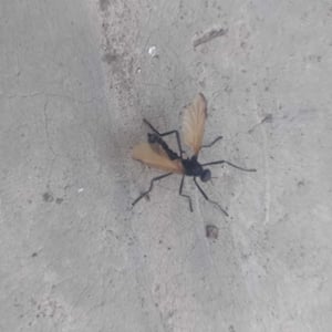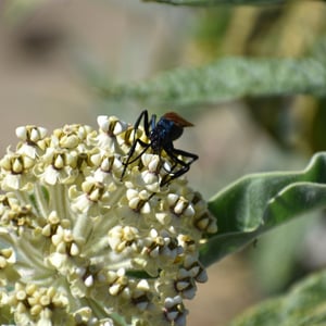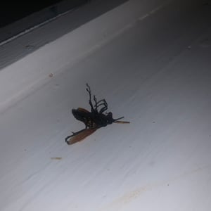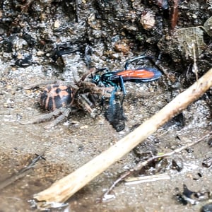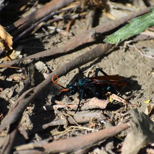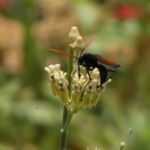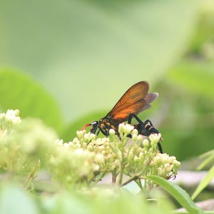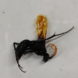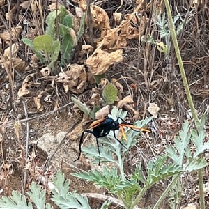 Pepsis mildei, commonly known as the Mildew Wasp, is a species of large solitary wasp found in tropical regions. The females of this species are known for their impressive size, reaching up to 2 inches in length. They are known to have a distinct black and orange coloration, and are known for their unique hunting behavior, as they paralyze tarantulas to serve as food for their larvae.