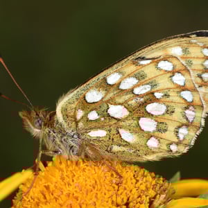 The Mormon Fritillary is relatively small in comparison to other fritillaries. Their wings are orange with small black patches, excepting the ventral hindwing, which has a green tinge accented by light silver streaks. These silver streaks vary between subspecies, with some possessing a reflective quality, and others appearing chalk white. On average, female wingspan ranges from 25-27mm, while males have a slightly smaller wingspan, from 23-26mm. These values are specific to a population in Colorado, and wingspan might vary between unique populations and subspecies.