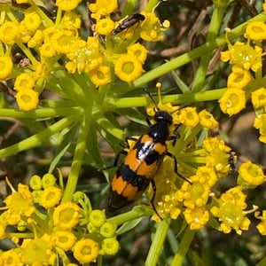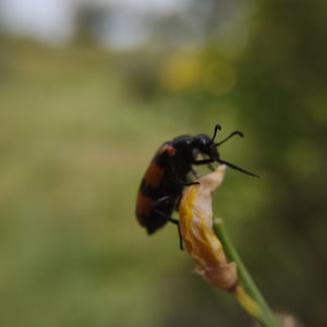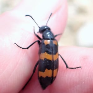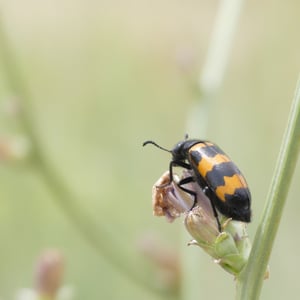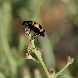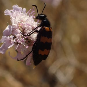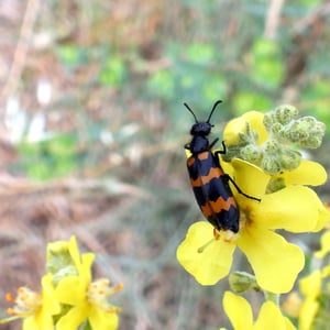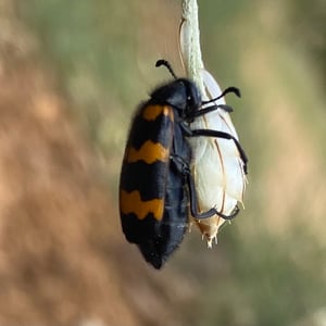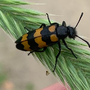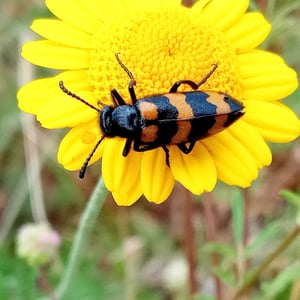 Mylabris variabilis, commonly known as the variable blister beetle, is an insect belonging to the family Meloidae. It is found in various regions of North America. This species is characterized by its elongated body, ranging in color from yellow to black, with variable patterns and markings. Variable blister beetles are known for their defensive secretion, cantharidin, which can cause blistering and irritation on contact with skin.