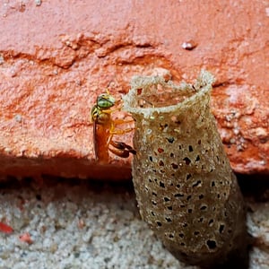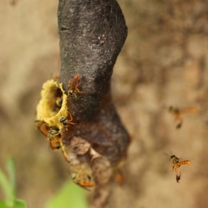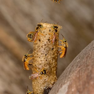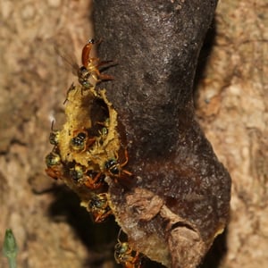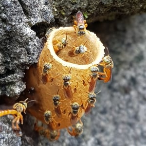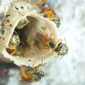 A T. angustula colony will only reproduce once a year, as opposed to many honeybees that can reproduce three or four times in a year. The largest colony cycle occurs during the summer in South America, with most of the new brood hatching between December and March. This time of the year coincides with the best foraging conditions, which ensure enough food can be provided for the larvae. Each colony has one reproductive queen to mate and lay eggs. Swarming Colonies are founded by swarming; a young queen and a small fraction of workers leave the mother nest for a new nest site. Before swarming, scout bees explore suitable cavities in the area surrounding the mother nest. This scouting often lasts between two days and two weeks. The new nest sites are within a few hundred meters of the mother nest to allow continued contact with the mother nest, which can last from a week up to six months for T. angustula, which is longer than many other bee species. Resources are transferred from the mother nest to the new nest, including pollen, honey, and cerumen, but the new nest continues to have very small stores compared to the mother nest. Cerumen, which comes from the mother nest, is a wax used to seal cracks and holes in the new nest site.A swarming colony can have as many as 10,000 bees, but less than 10% relocate to the new nest. Some workers help settle at the new nest site and then return to the mother nest within a few days. The mother colony cannot produce another swarm while the new nest is dependent on it, so once the new nest is settled, connection is severed. Nest building Once a nest site is found, the existing cavity must be cleaned. After the pre-existing container is ready to be inhabited, the workers build several horizontal brood combs in the center of the nest. This brood chamber is surrounded by layers of cerumen, called the involucrum, which helps maintain a constant climate in the brood chamber.Stingless bees add a distinct entrance tube to their nests. This tube is also made of wax and is thought to assist in protection from predators. The tube is on average 2 cm in length and 0.6 cm in diameter and is often closed during the night. Soldier bees are seen guarding this entrance at all hours.