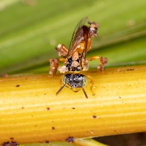 Tetragonisca angustula is a small eusocial stingless bee found in México, Central and South America. It is known by a variety of names in different regions (e.g. jataí, yatei, jaty, virginitas, angelitas inglesas, españolita, mariola, chipisas, virgencitas, and mariolitas). A subspecies, Tetragonisca angustula fiebrigi, occupies different areas in South America and has a slightly different coloration.T. angustula is a very small bee and builds unobtrusive nests, allowing it to thrive in urban areas. It also produces large amounts of honey, and is thus frequently kept in wooden hives by beekeepers. T. angustula hives are often overlooked, and since the bee lacks a stinger, it is not seen as a threat to humans. Many of their behaviors are concerned with colonizing a new nest and producing offspring, demonstrated by their swarming and nursing behaviors, however a special caste of T. angustula are soldiers who are slightly larger than the workers. The soldiers in a T. angustula nest are very good at protecting the hive against intruders which makes up for not having a stinger. Some of these soldiers hover in mid air outside the nest, which is seen in the adjacent picture.