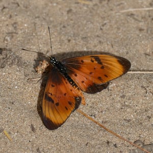 The wingspan is 55–65 mm. Adults are on wing year round, with a strong peak in late summer in southern Africa. A. natalica Bdv. (55 f) varies greatly in size, but is on an average larger than the following species [in its subgroup], having an expanse of 46 to 80 mm. The ground-colour of the wings above is reddish to orange-yellow or brown- yellow and occasionally in the females on the hindwing much darkened, dark red-brown; both wings at the base blackish to about vein 2; the forewing with apical spot 4 to 5 mm. in breadth and black fringes, sometimes also with the veins narrowly black; a basal dot in the cell and in 1b at the outer edge of the black basal spot; discal dots 4 to 6, 9 and 10 united into a transverse streak placed almost vertically to the costal margin; submarginal dots in 1b to 3; hindwing with unspotted or indistinctly spotted black marginal band 4 to 5 mm. in breadth, which in the male is sharply defined, but in the female sometimes shades into the darkened ground-colour without sharp delimitation. Wings beneath lighter, not darkened at the base; forewing without dark apical spot; hind wing with bright red spots between the basal dots and between the discal dots and the marginal band at least in 1b to 3; the marginal band with large yellow marginal spots and always sharply defined proximally. South and East Africa to Angola, southern Congo and British East Africa. Larva light yellow with white lateral line, white, black-edged dorsal line and a black streak on each side. Pupa yellowish white with black markings. - umbrata Suff. differs in having on the fore wing immediately behind discal spots 4 to 6 a broad dark grey, somewhat transparent transverse band, extending from the costal margin to vein 3 and distally dentate at the veins; between this band and the dark apical spot four submarginal spots of the ground-colour are thus separated off in cellules 3 to 6. The marginal band of the hindwing above is narrower than in the type-form and irregularly defined proximally. Mozambique to British East Africa. - female ab. albida ab. nov. approximates to the form umbrata, but has the ground-colour of the upper surface white and the marginal band on the upperside of the hindwing much widened, reaching the discal dots; wings beneath whitish yellow. Island of Pemba. - abadima Ribbe (= clarei Neave) forms a transition between umbrata and pseudegina [now species including abadima Ribbe and clarei Neave]. Both wings above with bright orange-yellow ground-colour; it differs from umbrata in having the marginal band on the upperside of the hindwing a mere line or only indicated by some black scales and the marginal spots on the hindwing beneath very large and only separated by the veins; the grey subapical band of the fore wing is lighter, more transparent and more indistinctly defined. The female is darker and the ground-colour forms three whitish spots before the apex of the forewing. Angola to the Cameroons, Uganda and Abyssinia. - pseudegina Westw. (55 f) [now species Acraea pseudegina ] is the north-western race and is distinguished from abadima by having the fore wing above entirely or for the most part blackish or black-grey. Senegal to Nigeria. Larva lighter than that of the type-form.