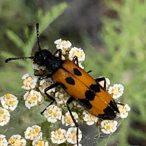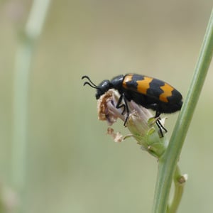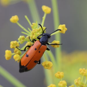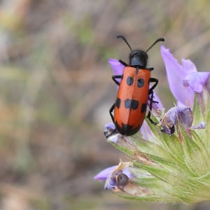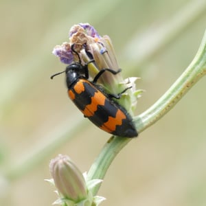 Mylabris is a genus of beetles belonging to the family Meloidae. These insects are commonly known as blister beetles due to their ability to release a toxic substance called cantharidin, which can cause blisters on human skin. Mylabris beetles are typically elongated and have a black or dark brown coloration with yellow or orange markings. They are found in various habitats worldwide, often feeding on plants and flowers.