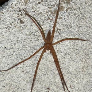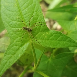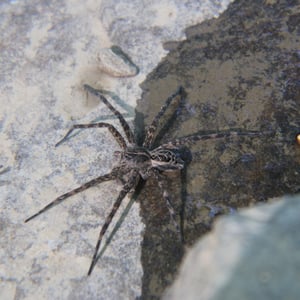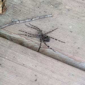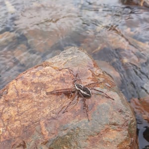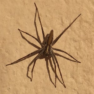 Nursery web spiders (Pisauridae) is a family of araneomorph spiders first described by Eugène Simon in 1890. They resemble wolf spiders (Lycosidae) except for several key differences. Wolf spiders have two very prominent eyes in addition to the other six, while a nursery web spider's eyes are all about the same size. Additionally, female nursery web spiders carry their egg sacs with their jaws and pedipalps instead of attaching them to their spinnerets as wolf spiders do. When the eggs are about to hatch, a female spider builds a nursery "tent", places her egg sac inside, and stands guard outside, hence the family's common name. Like the wolf spiders, however, the nursery web spiders are roaming hunters that don't use webs for catching prey. Species occur throughout the world except for extremely dry or cold environments, and are common just about everywhere. Many can walk on the surface of still bodies of water and may even dive beneath the surface temporarily to escape enemies. They can jump a distance of 5 to 6 in, but they have trouble climbing extremely smooth surfaces such as glass. The name "nursery web spider" is especially given to the European species Pisaura mirabilis, but this family also includes fishing spiders and raft spiders. Adult specimens may reach up to 15mm in length, including legs. The legs of the male are longer in relation to body size than those of the female. The female spider sometimes attempts to eat the male after mating. The male, to reduce the risk of this, often presents the female with a gift such as a fly when approaching in the hope that this will satisfy her hunger. Sometimes, this gift is a fake present intended to fool the female. Males may wrap the fake gift in silk, to deceive the female to mate. Females can detect the fake gift and terminate mating, negating the male's deception in not giving a real gift.