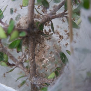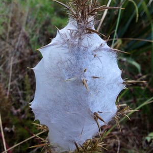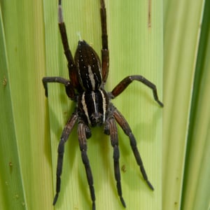 Dolomedes minor are most commonly seen through the summer months from November to May. Over these months the females have been found with egg-sacs attached to them which are carried for at least 5 weeks in their fangs. After this the female will start to construct her nursery web, which is not made to catch prey but to ‘nurse’ young. This is made at night and built amongst and at the tips of foliage. It can be around six inches or more in length and will house the eggs and young. At night the females guard the web and during the day have been noted to move towards the base of the vegetation. The spiderlings will emerge shortly after the webs construction, usually within a week or after they have changed skin, and after two weeks most young would have left the nest. It is presumed this is done by ‘ballooning’ a type of air dispersal to allow them to leave the nest. This air dispersal is done so on long floating strands of silk which can also aid leaving and moving to a variety of geographical boundaries. There has been sightings of adult males with young adult females but no courtship or mating has been recorded. In other Dolomedes species, sexual cannibalism is high so it is possible that D. minor males will try mate with virgin females to avoid this. Hurried copulation (mating) has been found to be common in other Dolomedes species also.