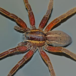 Dolomedes minor is pale brown with some being grayish, like the rocks around which they live, helping to camouflage them against predators. (Arnqvist, 1992) The spider has large pedipalps, which are usually used for sensory purposes. The palps in the male Dolomedes minor are modified for putting sperm into the female's epigyne, which is located on the underside of the female's abdomen. The female Dolomedes minor can easily be identified based on this location of the epigyne. They possess large chelicerae, which are located just below the eyes. (Andrews, 1986) The spider has a body length of about 18 mm. The females are almost twice the size of the males. They move very fast and possess a long leg-span: over sixty millimeters for a fully grown female.