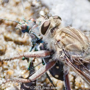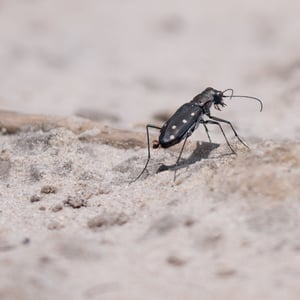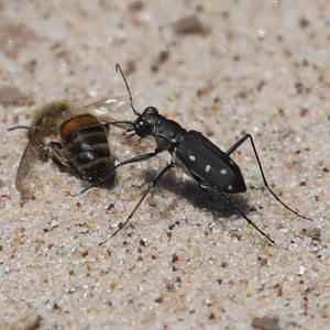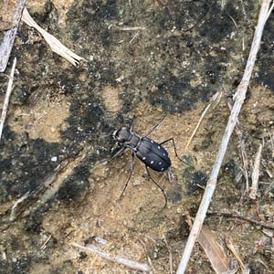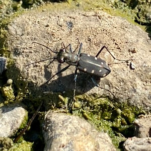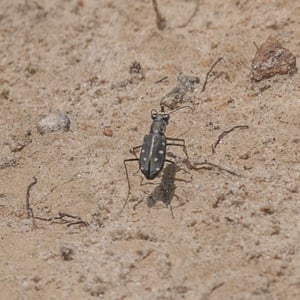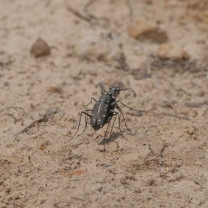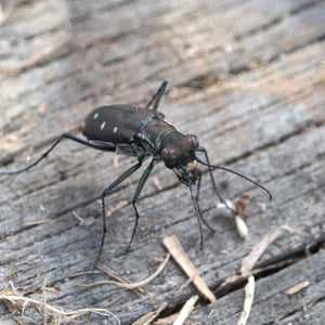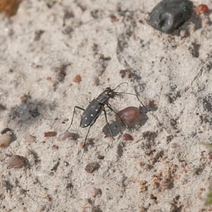 Cicindela ocellata, commonly known as the eyed tiger beetle, is a species of ground-dwelling insect belonging to the family Carabidae. It is characterized by its vibrant metallic green or blue coloration, with distinctive white or yellow spots on its elytra, resembling eyes. This predatory beetle is known for its exceptional speed and agility, using its long legs to chase and capture its prey. Found in sandy or gravelly habitats, the eyed tiger beetle is an important indicator species for the health of its ecosystem.