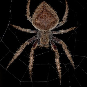 Orb-weaver spiders are members of the spider family Araneidae. They are the most common group of builders of spiral wheel-shaped webs often found in gardens, fields, and forests. The English word orb can mean "circular", hence the English name of the group. Araneids have eight similar eyes, hairy or spiny legs, and no stridulating organs. The family has a cosmopolitan distribution, including many well-known large or brightly colored garden spiders. With 3,067 species in 177 genera worldwide, Araneidae is the third-largest family of spiders (behind Salticidae and Linyphiidae). Araneid webs are constructed in a stereotyped fashion. A framework of nonsticky silk is built up before the spider adds a final spiral of silk covered in sticky droplets. Orb webs are also produced by members of other spider families. The long-jawed orb weavers (Tetragnathidae) were formerly included in the Araneidae; they are closely related, being part of the superfamily Araneoidea. The family Arkyidae has been split off from the Araneidae. The cribellate or hackled orb-weavers (Uloboridae) belong to a different group of spiders. Their webs are strikingly similar, but use a different kind of silk.
