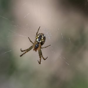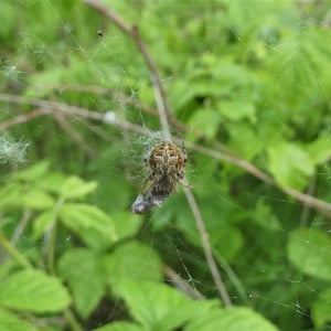 Generally, orb-weaving spiders are three-clawed builders of flat webs with sticky spiral capture silk. The building of a web is an engineering feat, begun when the spider floats a line on the wind to another surface. The spider secures the line and then drops another line from the center, making a "Y". The rest of the scaffolding follows with many radii of nonsticky silk being constructed before a final spiral of sticky capture silk. The third claw is used to walk on the nonsticky part of the web. Characteristically, the prey insect that blunders into the sticky lines is stunned by a quick bite, and then wrapped in silk. If the prey is a venomous insect, such as a wasp, wrapping may precede biting and/or stinging. Much of the orb-spinning spiders' success in capturing insects depends on the web not being visible to the prey, with the stickiness of the web increasing the visibility and so decreasing the chances of capturing prey. This leads to a trade-off between the visibility of the web and the web's prey retention ability. Many orb-weavers build a new web each day. Most orb-weavers tend to be active during the evening hours; they hide for most of the day. Generally, towards evening, the spider will consume the old web, rest for approximately an hour, then spin a new web in the same general location. Thus, the webs of orb-weavers are generally free of the accumulation of detritus common to other species, such as black widow spiders. Some orb-weavers do not build webs at all. Members of the genera Mastophora in the Americas, Cladomelea in Africa, and Ordgarius in Australia produce sticky globules, which contain a pheromone analog. The globule is hung from a silken thread dangled by the spider from its front legs. The pheromone analog attracts male moths of only a few species. These get stuck on the globule and are reeled in to be eaten. Both genera of bolas spiders are highly camouflaged and difficult to locate. The spiny orb-weaving spiders in the genera Gasteracantha and Micrathena look like plant seeds or thorns hanging in their orb-webs. Some species of Gasteracantha have very long, horn-like spines protruding from their abdomens. One feature of the webs of some orb-weavers is the stabilimentum, a crisscross band of silk through the center of the web. It is found in several genera, but Argiope – the yellow and banded garden spiders of North America – is a prime example. As orb-weavers age, they tend to have less production of their silk, many adult orb-weavers can then depend on their coloration to attract more of their prey. The band may be a lure for prey, a marker to warn birds away from the web, and a camouflage for the spider when it sits in the web. The stabilimentum may decrease the visibility of the silk to insects, thus making it harder for prey to avoid the web. The orb-web consists of a frame and supporting radii overlaid with a sticky capture spiral, and the silks used by orb-weaver spiders have exceptional mechanical properties to withstand the impact of flying prey. The orb-weaving spider Zygiella x-notata produces a unique orb-web with a characteristic missing sector, similar to other species of the Zygiella genus in the Araneidae family. During the Cretaceous, a radiation of angiosperm plants and their insect pollinators occurred. Fossil evidence shows that the orb web was in existence at this time, which permitted a concurrent radiation of the spider predators along with their insect prey. The capacity of orb–webs to absorb the impact of flying prey led orbicularian spiders to become the dominant predators of aerial insects in many ecosystems. Insects and spiders have comparable rates of diversification, suggesting they co-radiated, and the peak of this radiation occurred 100 Mya, before the origin of angiosperms. Vollrath and Selden (2007) make the bold proposition that insect evolution was driven less by flowering plants than by spider predation – particularly through orb webs – as a major selective force. On the other hand some analyses have yielded estimates as high as 265 Mya, with a large number (including Dimitrov et al 2016) intermediate between the two. Most arachnid webs are vertical and the spiders usually hang with their head downward. A few webs, such as those of orb-weavers in the genus Metepeira have the orb hidden within a tangled space of web. Some Metepiera are semisocial and live in communal webs. In Mexico, such communal webs have been cut out of trees or bushes and used for living fly paper. In 2009, workers at a Baltimore Wastewater Treatment Plant called for help to deal with over 100 million orb-weaver spiders, living in a community that managed to spin a phenomenal web that covered some 4 acres of a building with spider densities in some areas reaching 35,176 spiders per cubic meter.