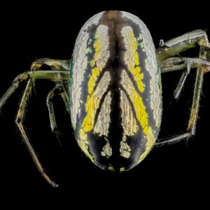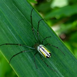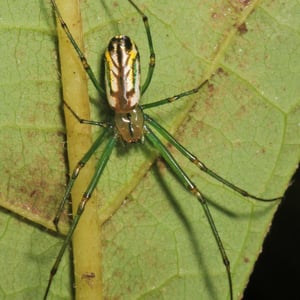 Leucauge venusta, known as the orchard spider, is a long-jawed orbweaver spider that occurs from southern Canada to Colombia, along the East coast, reaching into the central US, also in South Asia.The web is often oriented horizontally, with the spider hanging down in the center. It is distinctively colored, with leaf-green legs and sides (which can sometimes vary to a dark green or even orange). The underside of its thorax is spotted with yellow and black, the top is silvery with brown and black streaks. The neon yellow, orange or red spots on the rear of the abdomen are variable in size among individuals and sometimes absent. This species is parasitised by a wasp larva which attaches itself externally at the junction of the cephalothorax and abdomen. A similar species in the same genus is Leucauge mariana.