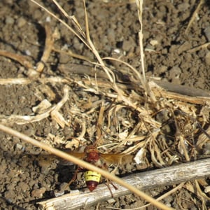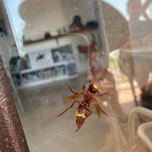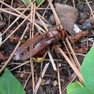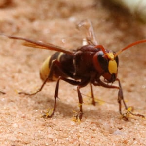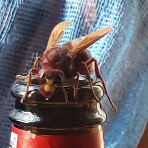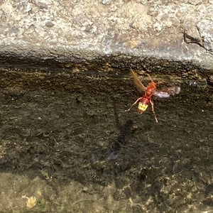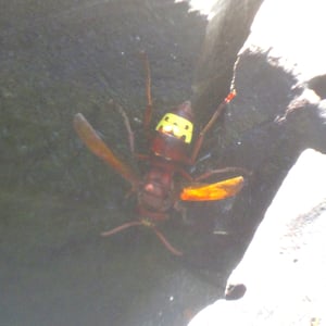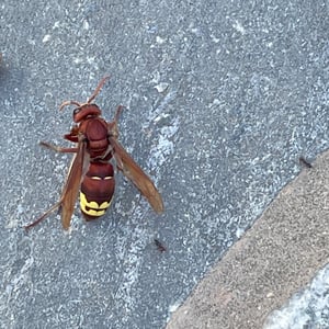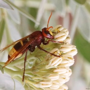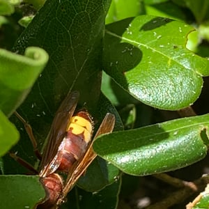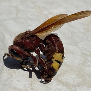 Vespa orientalis, commonly known as the Oriental hornet, is a species of large wasp found in parts of Asia and the Middle East. It is known for its distinct coloration, with a dark brown or black body and yellow stripes. Oriental hornets are social insects that build nests underground and are known for their aggressive behavior when their nest is threatened.