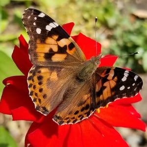 Painted lady butterflies have a visual system that resembles that of a honey bee. Adult V. cardui eyes contain ultraviolet, blue, and green photoreceptors. Unlike other butterflies, such as the monarch or red postman butterflies, painted ladies lack red receptors, which means that they are not sensitive to red light. Behavioral studies on the related species, Vanessa atalanta, have demonstrated that V. atalanta cannot discriminate yellow light from orange light or orange light from red light.